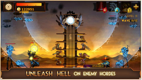 游戏的玩法还算是有点意思,防护塔的造型是呈楼层状的,一开始会有4个平台,当这4个平台都建造起了攻击装置的时候,防护塔会多出新的平台,并且每种防御工事可以进行位置切换,这样的设置增加了不少的战略可能性,并且攻击装置要进行升级的话就需要把装置拖拽到到箭头符号那里进行,操作略为麻烦,所以一定要眼疾手快,当然技能的应用也必须掌握,右上角的技能都有很强的威力,关键时刻能救自己一命,游戏关于攻击装置以及塔防还有属性升级,升级需要消费金币,金币可以由内购获得,建议玩家们量力而行。