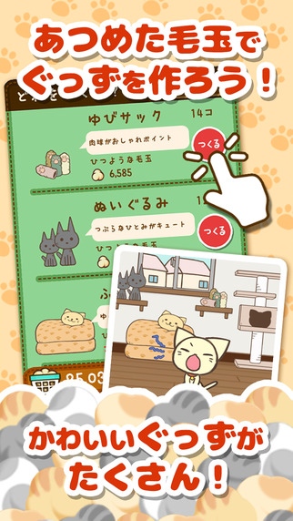 《猫的毛》(ねこのけ)是一款休闲益智游戏哦,该游戏玩法是收集喵星人的毛,用喵星人的毛做成商品的游戏。游戏中点击喵星人就能收集猫毛,收集猫毛球制作商品,并并且推进故事前进的一款放置型游戏。萌萌哒的喵星人一动,就会掉出毛球,喜欢喵星人的你千万不要错过啦。