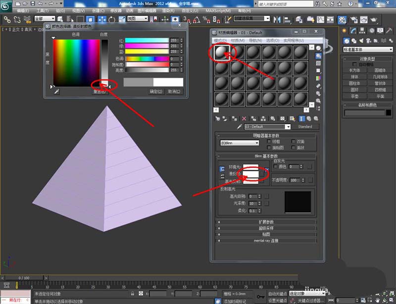 2、点击【材质编辑器】,弹出材质编辑器设置栏,按图示设置一个白色材质球并附加给模型。选中模型,点击【对象颜色】将模型的对象颜色设置为:黑色。点击鼠标右键-【转化为】-【转化为可编辑多边形】;
