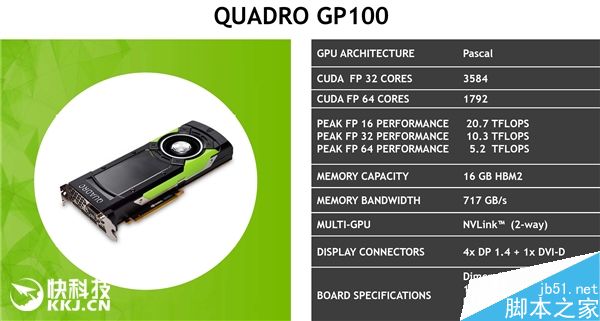 Quadro GP100基于Pascal核心,单精度CUDA 3584个,双精度CUDA 1792个,半精/单精/双精浮点运算性能分别是20.7T、10.3T和5.2T,匹配16GB HBM2显存,带宽高达717GB/s,功耗235W。