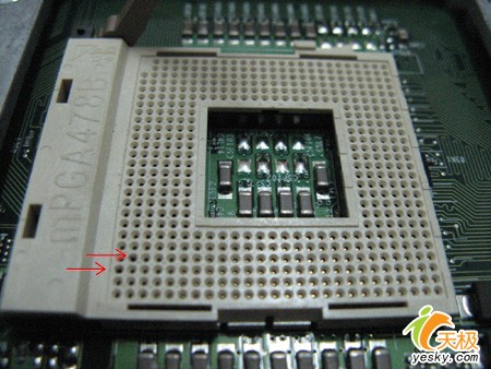 同时478 CPU座上的两个针孔也非常明显的发黑变大,内部的金属簧片已经看不到金属光泽,如图二所示。